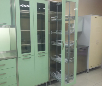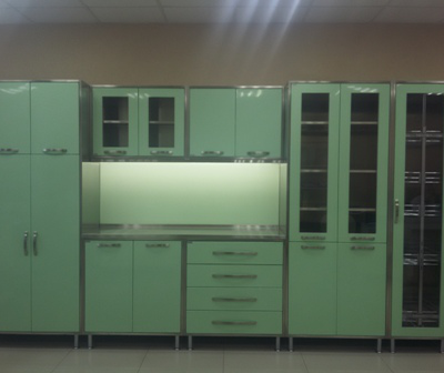Каркасы мебели выполнены из нержавеющей стали  марки AISI 304, фасады изготовлены из холоднокатаной стали, покрытые полимерно-порошковой краской (RAL 6019), устойчивой к обработке дезинфицирующими средствами.
