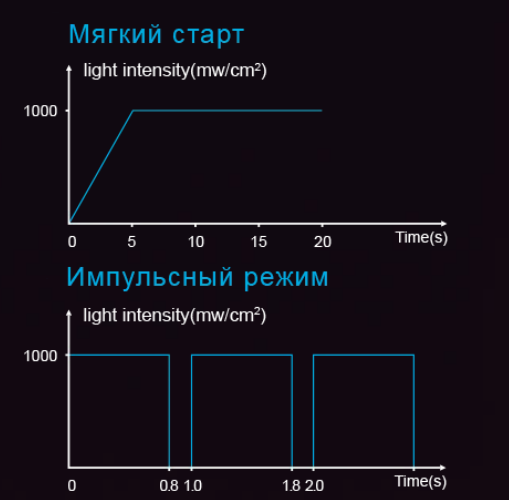 - в режиме полимеризации 1000mw/cm², 1500mw/cm², 2300mw/cm² , 600mw/cm²