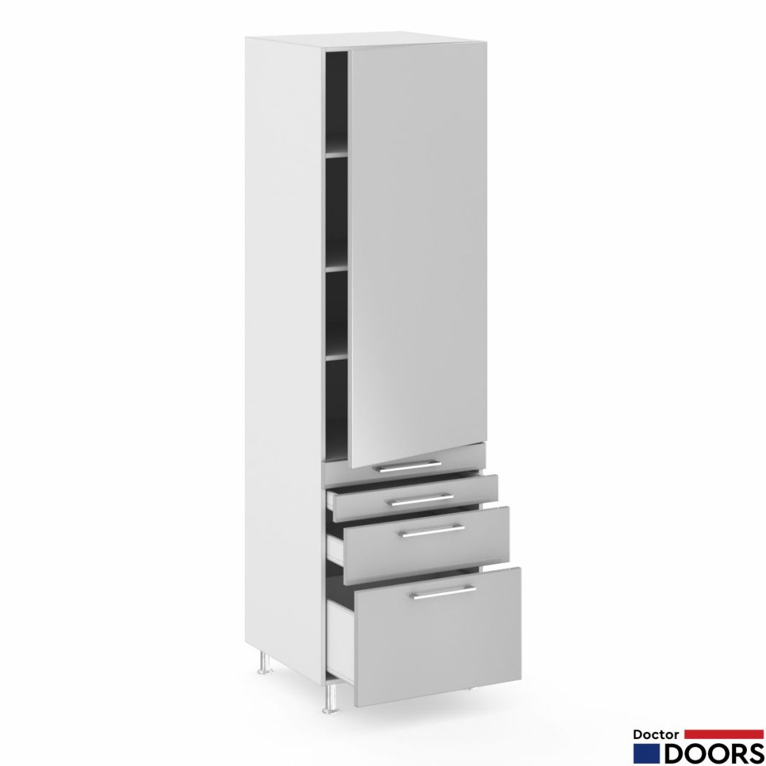 Медицинский шкаф для медикаментов с одним распашным фасадом, четырьмя выдвижными ящиками и тремя полками ЛДСП.