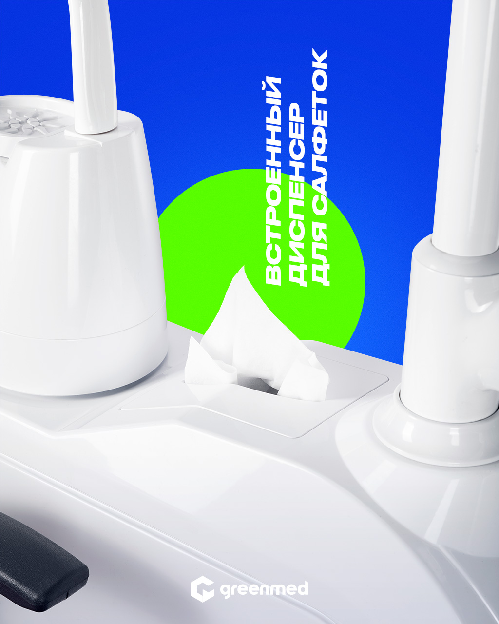Встроенный диспенсер для салфеток, удобный и аккуратный, позволяет быстро и легко вынимать салфетки, поддерживать порядок во время и после процедуры.