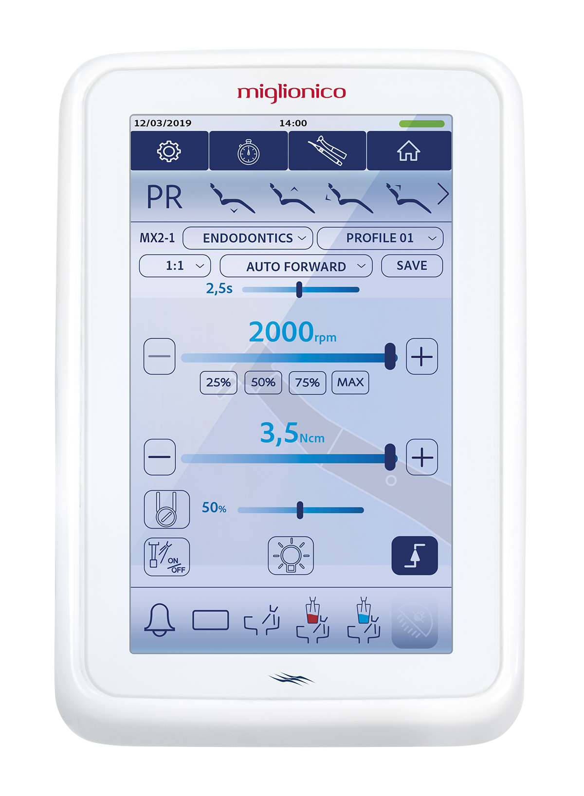 - Сенсорный дисплей панели управления позволяет быстро и точно устанавливать параметры каждого выбранного для работы инструмента, с программами для эндодонтии (ENDO STOP, ENDO REV) и хирургии (AUTO STOP, AUTO REV, AUTO FORW).