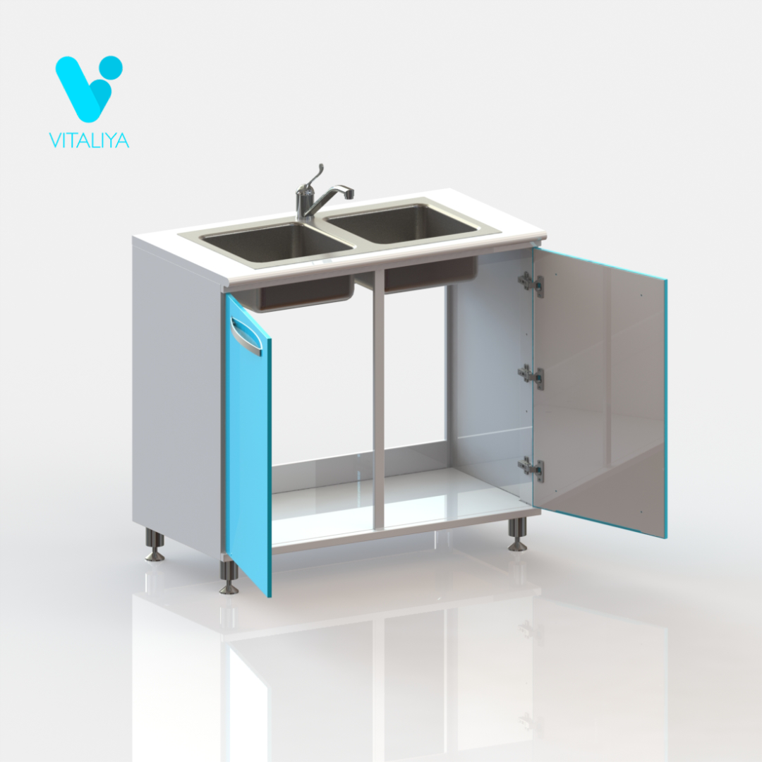 Тумба металлическая цельносварная, выполнена из листового металла толщиной 1 мм и окрашена полимерно-порошковой краской. Двери установлена на петли с механизмом плавного закрывания, производства компании HETTICH, Германия. На фасады установлена ручка-скоба из нержавеющей стали с межцентровым расстоянием 320 мм, цвет брашированный сатиновый никель. Задняя стенка тумбы имеет технологические вырезы под коммуникации. Тумба изготовлена в варианте на регулируемых хромированных опорах высотой 100 мм. Комплектуется раковиной из нержавеющей стали, производства компании Reginox, Голландия, сифоном и локтевым смесителем.