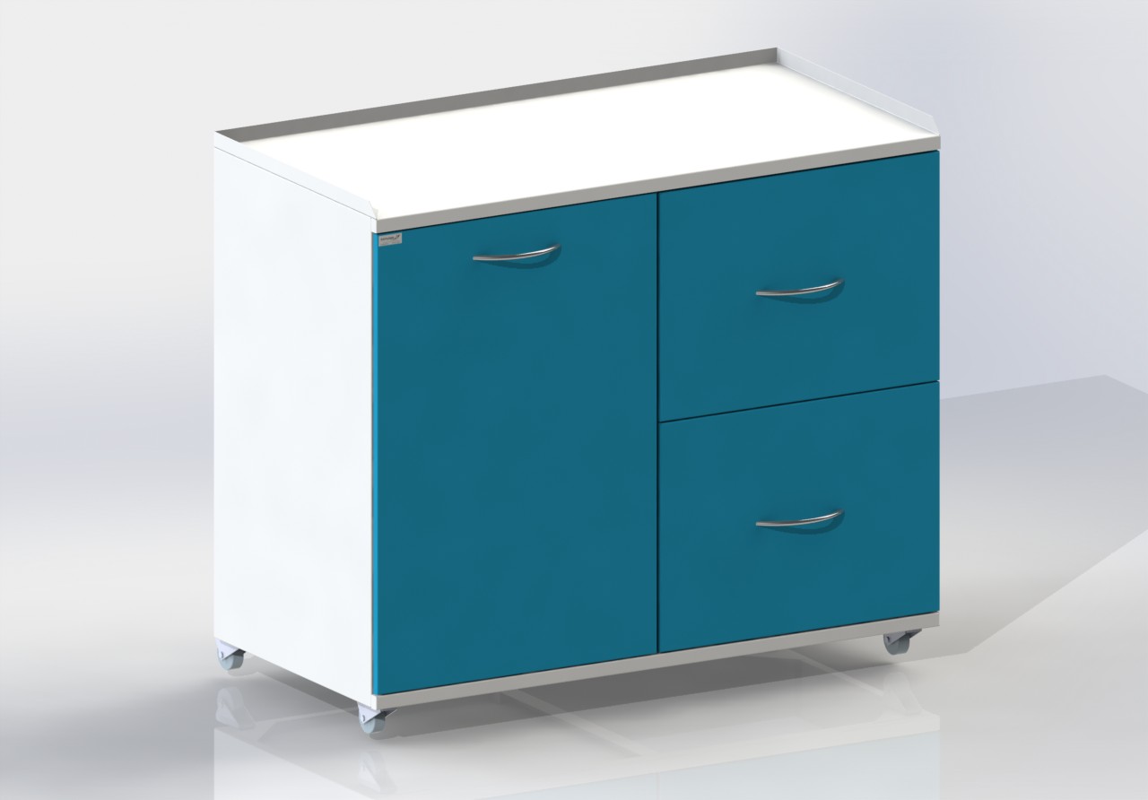 Передвижная тумба распашной дверью с двумя металлическими полками, двумя выдвижными ящиками, сверху столешница, сбоку ручки.