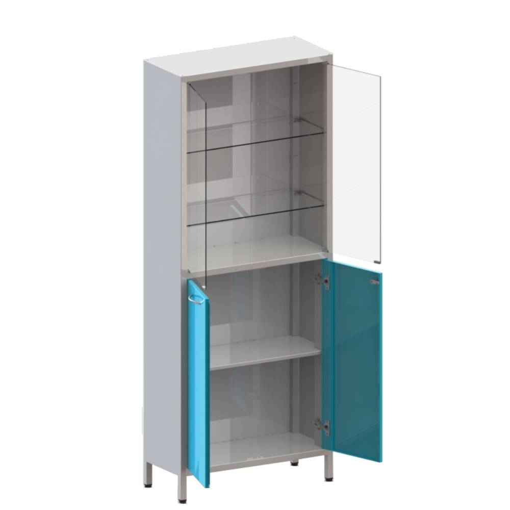 Двухстворчатый. Верхняя секция с дверьми из стекла. Внутри 2 стеклянные регулируемые полки. В нижней секции метал. двери с замком и полкой.