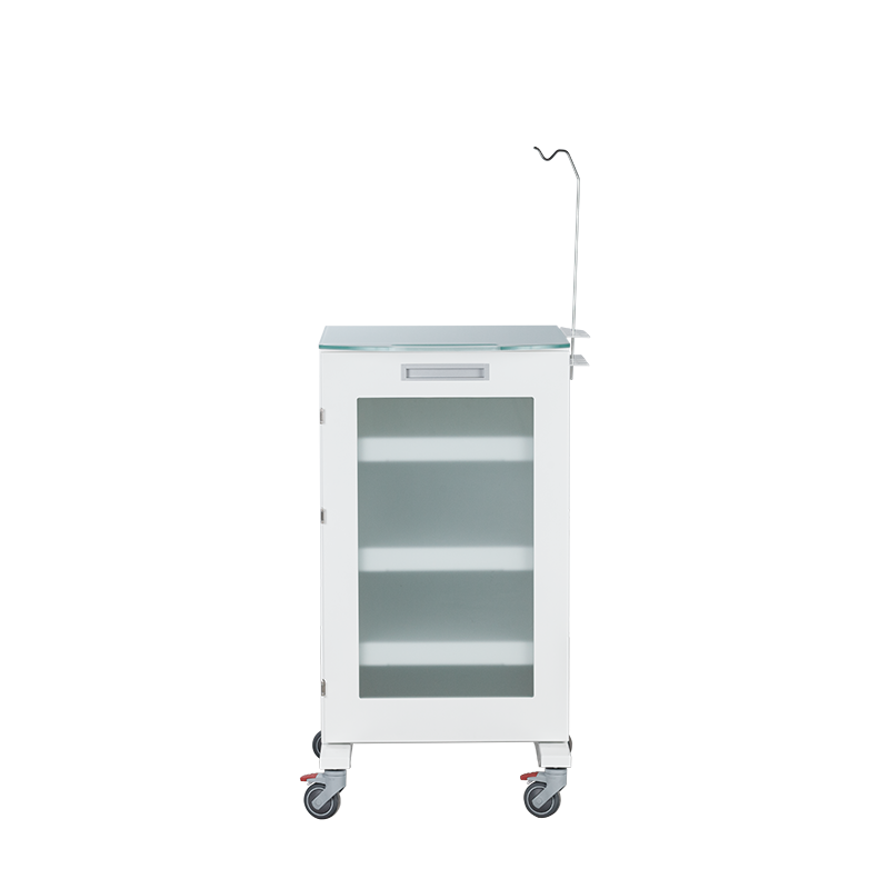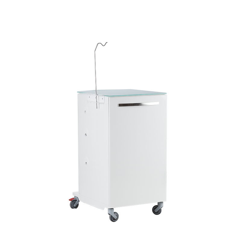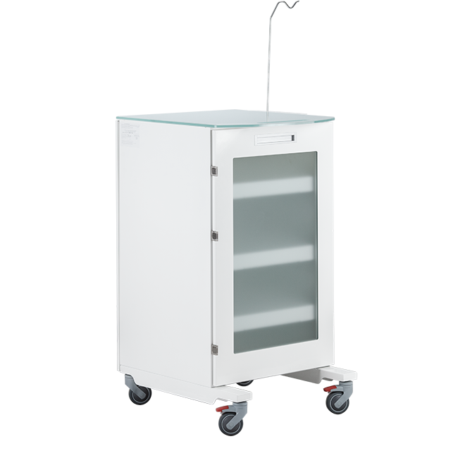 С тремя выдвижными полками. Столик оснащён специализированным держателем для стоматологических наконечников, а также штативом для крепления системы подачи физ.раствора. Столик установлен на колёса диаметром 75мм, два колеса с тормозом.