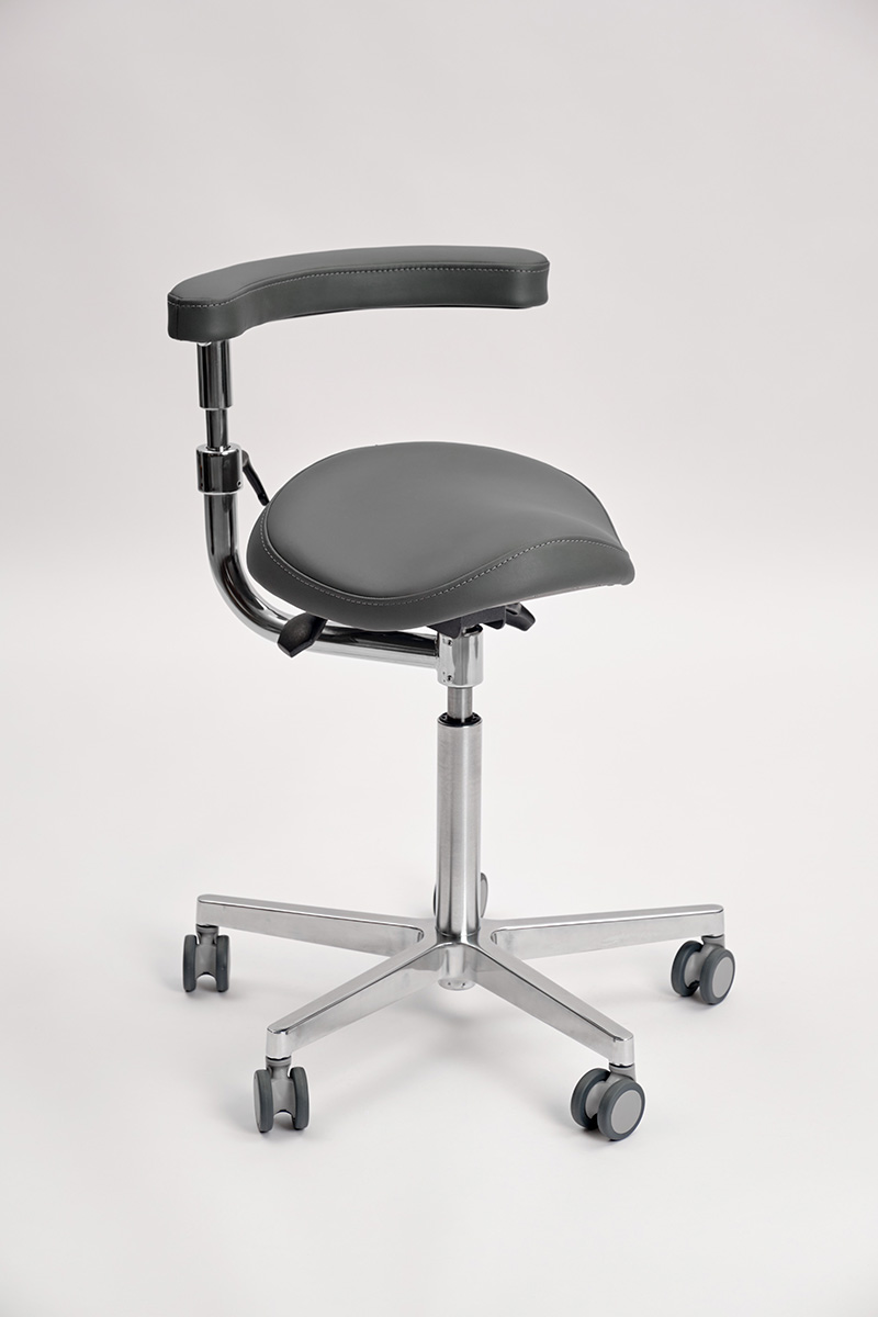 Стул оснащён абдоминальным упором, который позволяет поддерживать поясничную область врача и обеспечивает комфорт во время работы. Благодаря возможности настройки на 3600, абдоминальный упор также служит для поддержки локтей.
